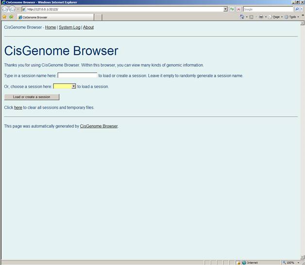 Start screen of the browser, user can create or load sessions here.