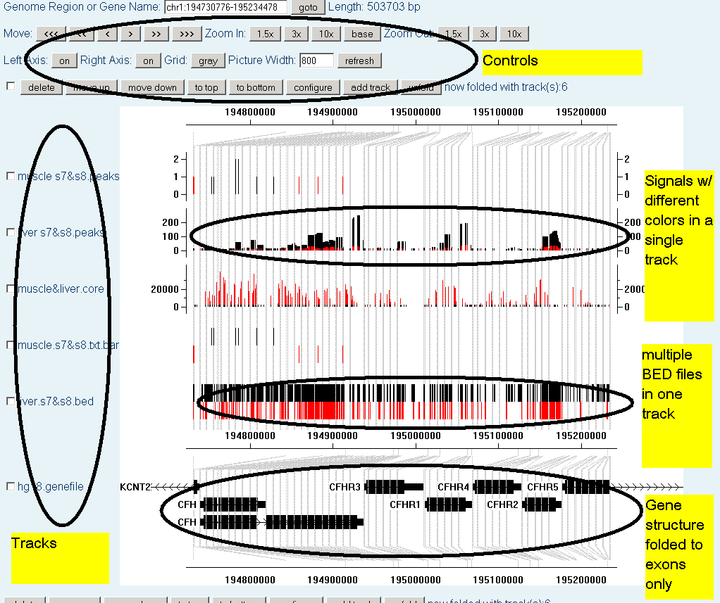 Several tracks of signals together with gene structures, folded with respect to the gene structures so that the empty spaces between genes and exons are packed.